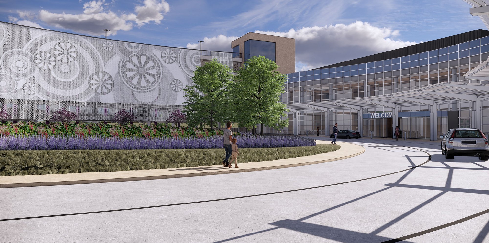 Aqua & the Floral Blossom is a site-specific façade designed exclusively for the new Norman Regional HealthPlex's garage building. (Architectural renderings by HGA).
